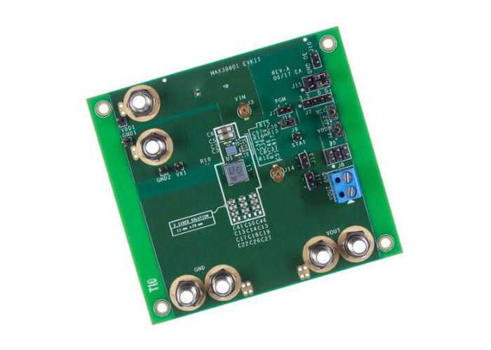 This evaluation board features the MAX38801 step-down switching regulator, designed for embedded solutions and power management applications.